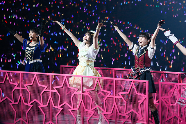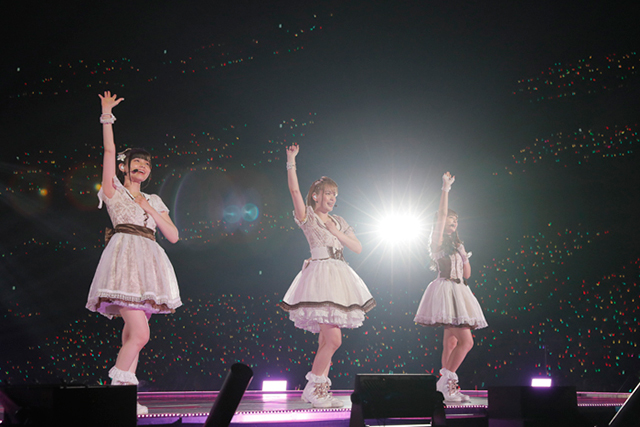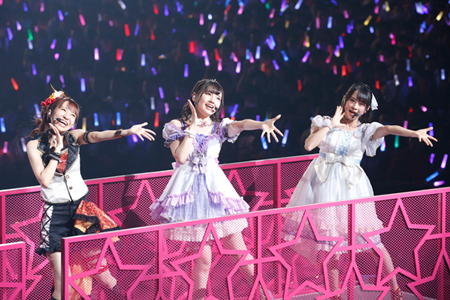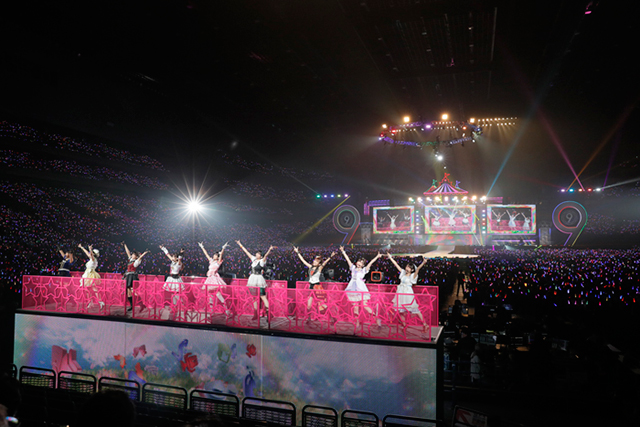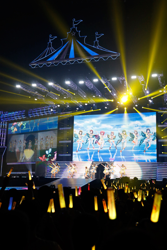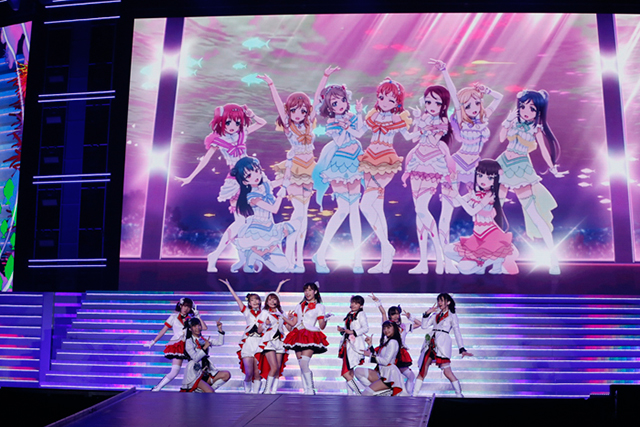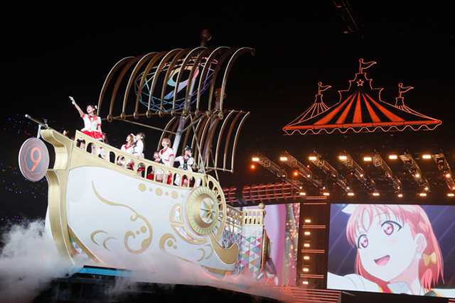 続いて、Aqoursが大型船に乗り込みセンターステージに出航。μ’sへの憧れを歌った「届かない星だとしても」と、自分たちだけの“輝き”に手を伸ばした「MIRAI TICKET」を続けて歌唱し、アニメ内での成長過程をなぞるかのようだった。思えば、今やシリーズの主力ユニットとなり、今回のイベントを牽引するというプレッシャーもあったはず。しかし、上記2曲やこの後の歌唱曲「君のこころは輝いてるかい?」を体験しただけでも、彼女たちの輝きがこれまで以上に力強くなっていると改めて知らしめられた。
