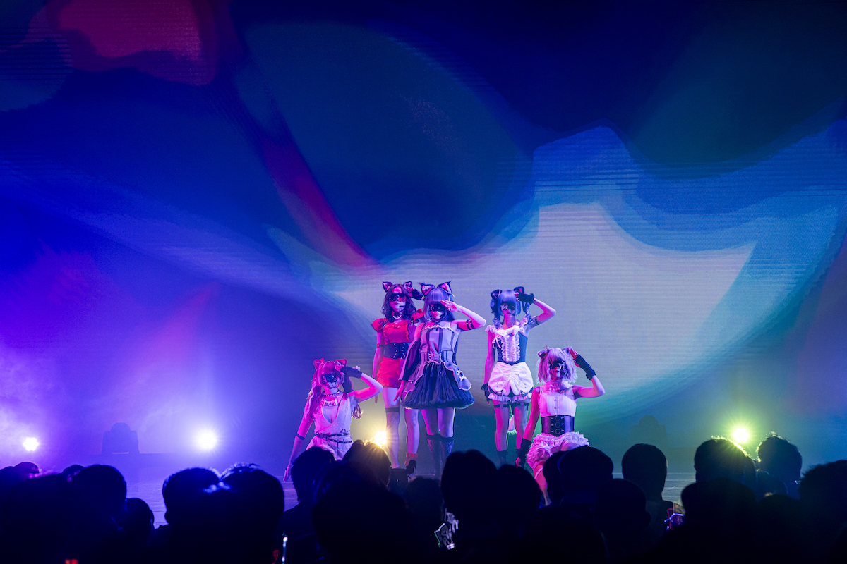 まずは、チャイナ調とピコピコのサウンドが心地よく、どこか平成を感じさせるポップナンバー「再現ガールフレンド」から。ステージの前まで出て観客のクラップを誘うと、観客のクラップが会場に鳴り響く。「ここからのパートも、もっと楽しんでくれるかにゃ?」(VITTE)、「会場のみんな、配信のみんなブチ上がる準備はよろしくて?」(RARA)。間髪入れず、「ここからはCHINO先生とNEFFYさんのターン」(CHINO)、「サビはNEFFYさんたちをマネして踊ってね!」(NEFFY)と声をかけ始まった「幸福アウトサイダー」。アイドル的な可愛さが全開の同曲では、会場には〈ハイ!ハイ!〉という掛け声が響き渡った。続いて魅せたのはRARAとVITTEによるバラード「哀愁トワイライト」。一転して厳かなムードが会場に漂い、手を繫いで歌う2人を観客は静かに見守った。